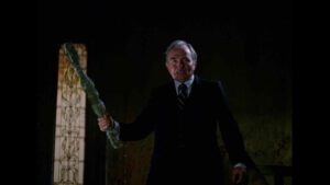 I doubt anyone reading this has never seen this, deservedly, revered entry into the varied catalog of King adaptations at least once in their lifetimes, so I’ll go with the condensed version. Troubled author Ben Mears (David Soul; Starsky & Hutch) returns to his childhood home, set on writing a new novel inspired by the looming, spooky local ruin, the Marsten House. Said house, however, isn’t as vacant as expected with the arrival of mysterious antique dealers Richard Straker (James Mason; Lolita) and the perpetually absent Mr. Barlow (Reggie Nalder; Mark of the Devil).