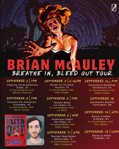 Brian McAuley: What I’ve definitely seen is a lot of people don’t think they like horror until they find the right gateway into it. Everybody has certain things that are triggering or pushes them away, and horror obviously delves into all of the possible triggers and traumas. I think just finding what’s the place and subgenre that feels like the kind of safe space for me to play in the shadows and the darkness and all of that. I think the slasher genre is what most people, their first thought of horror and the first thing that people are like, “No, I don’t want that because I don’t want gore,” but it’s been fun to see even just with the early reviews of Breathe In, Bleed Out of thriller readers finding this book and discovering, “I think I like slashers and horror,” because it is a fine line. I think just finding what’s the subgenre that really resonates with you because it really is such a diverse genre.